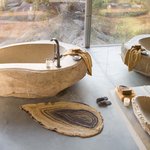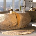 Plush pile bath rug combining the looks of agate stone with petrified wood. This product is discontinued and limited to stock on hand.