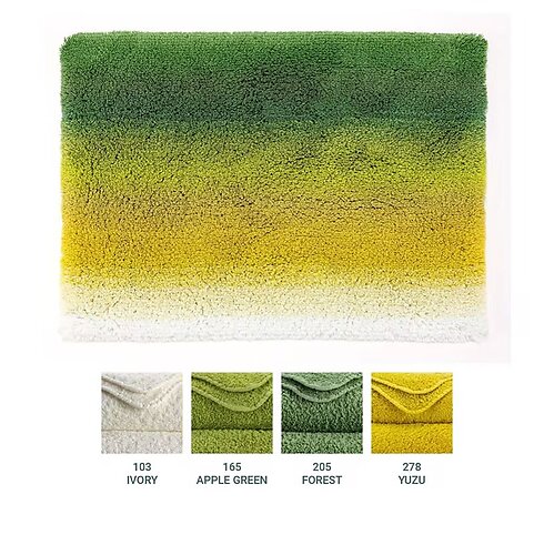 Bring the calm of the forest into your bathroom with the Aurore Bath Rug in Forest Green, a harmonious blend of nature's most soothing tones. This multi-color striped bath rug features elegant shades of Ivory 103, Apple Green 165, Forest Green 205, and a vibrant hint of Yuzu Yellow 278, evoking a peaceful woodland escape. The dynamic stripes add movement and warmth, making this piece a stunning accent in both minimalist and bold bath spaces. Special order, usually ships in 4-6 weeks. Shown here are the 29x39" sizes, on the 20x30" rugs the pattern runs left to right.