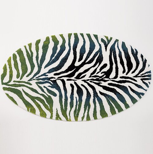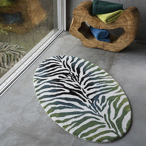 The generous 35x57" oval shape adds an unexpected, organic flow to traditional bathroom layouts. Its bold stripes and fluid silhouette offer dynamic contrast against hard surfaces like tile or stone, making it ideal for contemporary spaces that crave artistic, luxury accents. Whether anchoring a minimalist aesthetic or enriching a jungle-themed retreat, the Karoo is a visual centerpiece.