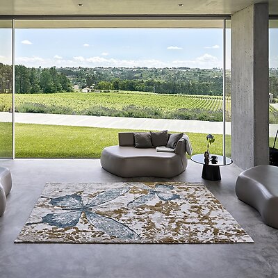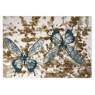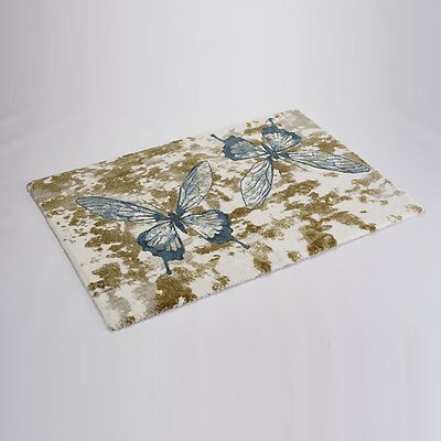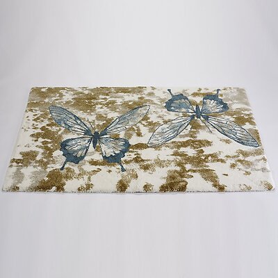 Meadow features a pair of blue butterflies hovering above an ivory and gold background. Elegant and stylish, Meadow rug will coordinate with a variety of styles and add interest to your decor. Touches of golden Lurex fibers add visual interest as well.