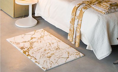 The Paros rug from Abyss Habidecor reminds us of a golden accented marble slab with hints of metallic crystal provided from the Lurex fibers. Rich and beautiful.