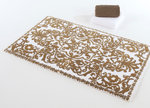 The Perse rug from Abyss Habidecor combines an elegant old world pattern in gold with glittering accents of gold-metallic colored fiber elements woven into a white base with brown accents.