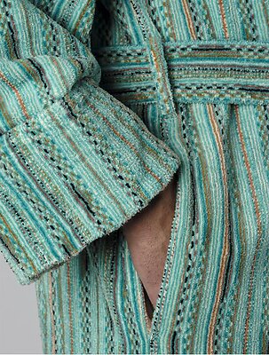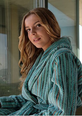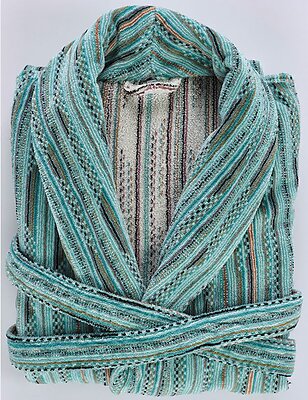 The Lulabi robe by Abyss features a multi-color terry body with southwest pattern. These robes are Unisex. Made with 100% extra long staple Giza Egyptian Cotton. 450 g/m2