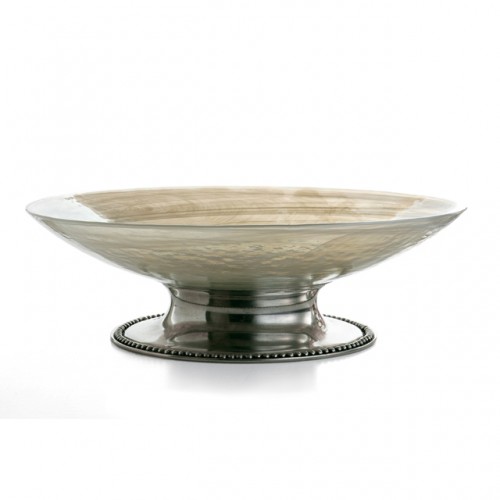 Inspired by Florentine alabaster, this wonderful large serving bowl is made from mouth-blown glass swirled with white and finished with an iridescent glaze. The color of this large serving bowl becomes a slightly khaki-champagne tone that is beautiful. This large, elegant serving bowl is then trimmed with extraordinary pewter beading. Italian pewter and glass, Hand made in Italy.