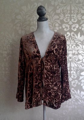New Primrose is a wonderfully light weight fabric that features a leafy floral pattern. This brown womans velvet jacket should be worn over a liner or tank. Machine washable in cold gentle cycle and tumble dry on low.