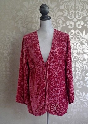 New Primrose is a wonderfully light weight fabric that features a leafy floral pattern. This ruby pink / red pink woman's velvet jacket should be worn over a liner or tank. Machine washable in cold gentle cycle and tumble dry on low.