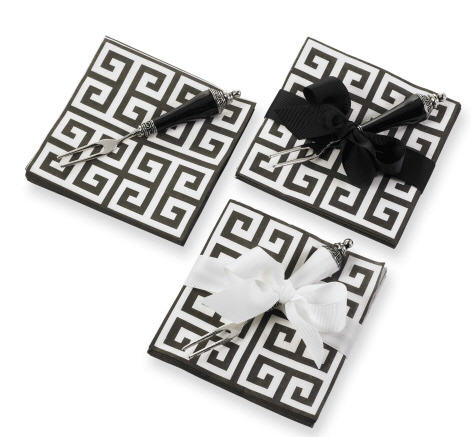 These black and white greek key cocktail napkin sets come with 12x 3-ply paper cocktail napkins (approximately 5" square folded) and a serving fork in your choice of black or white handle. Items are packed in clear cellophane bag and coordinating ribbon for a beautiful gift presentation.
