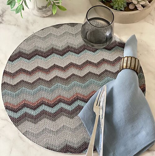 These 15" round placemats are made of 100% Phthalate free vinyl for easy care, just wipe with a damp cloth. Bargello provides you with a cool, contemporary look without any hassle. The multicolored zigzag pattern allows you to pair it with many different napkins and the texture vinyl easy care mats allow you to clean up with a breeze. These placemats are completely vinyl, giving you both a high design and ease of care. They are perfect for all your indoor and outdoor soirees any season. Made in Turkey. Click link to view other Bodrum Placemats