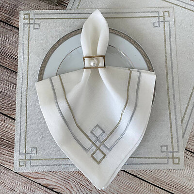 Classic yet contemporary, Link embroidered off-white napkins will add an elegant touch to any table year around. There are matching mats in these colors.