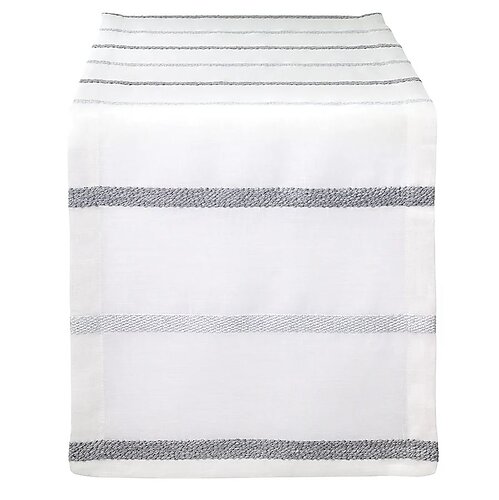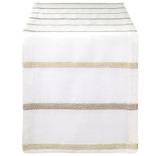 Made from a high-quality blend of 57% linen, 21% polyester, 18% polyacrylic, and 4% polyamide, the Bodrum Band Table Runner is designed to offer durability alongside its stylish appearance. Its sheer fabric captures the light beautifully, enhancing the metallic stripes and neutral tones that make this runner a versatile choice for coordinating with various color schemes and dinnerware patterns. It pairs exceptionally well with Bodrum's Metallic Thread napkins, allowing for a cohesive and polished table arrangement.