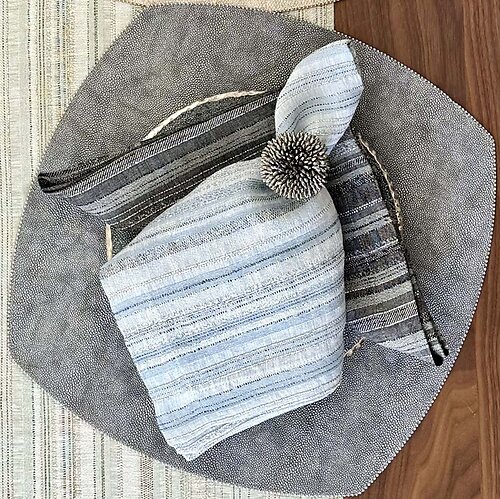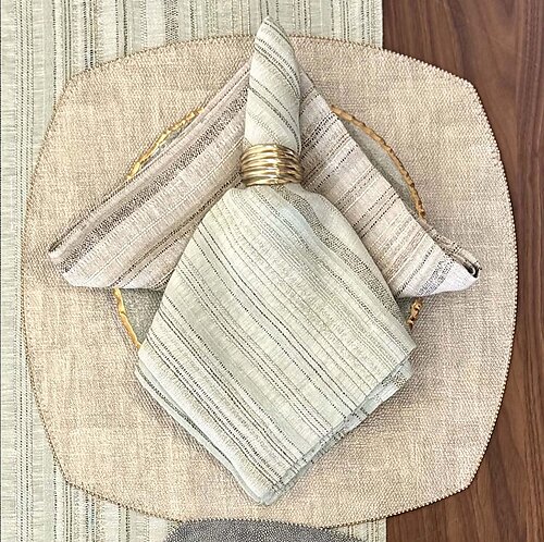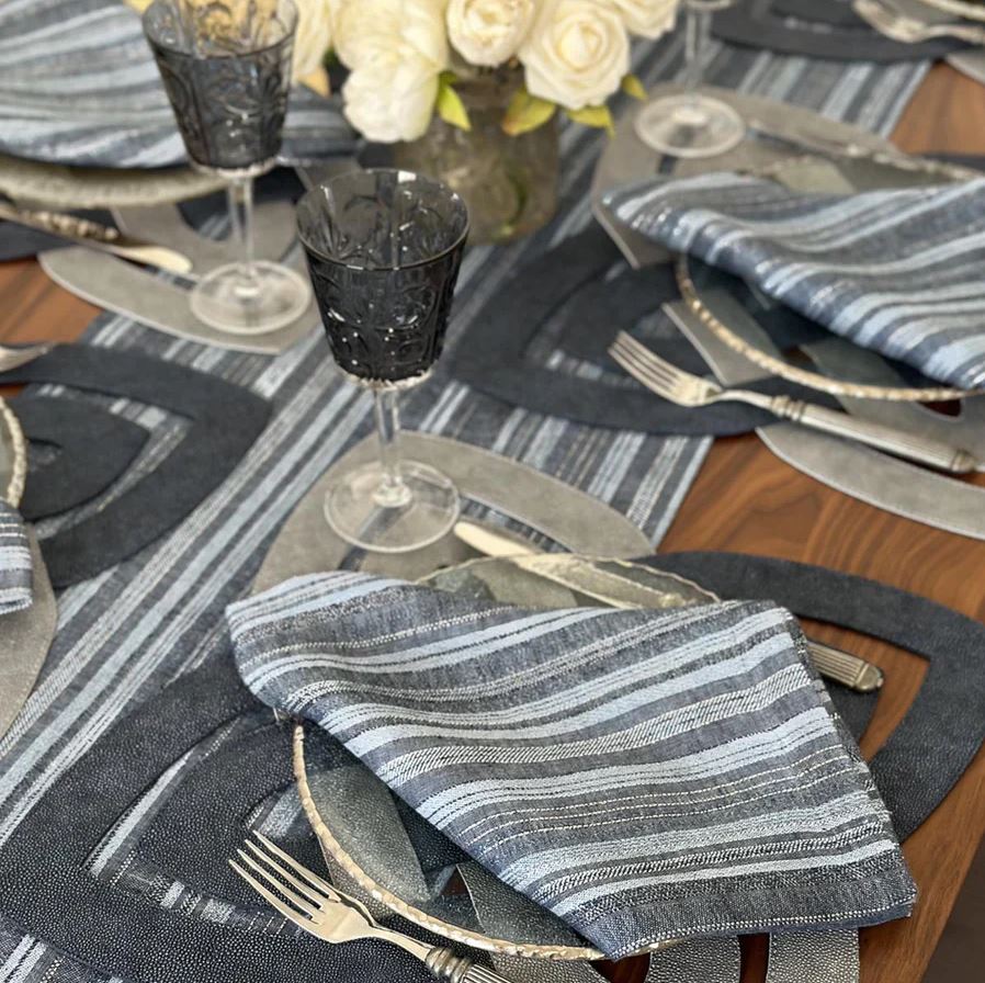 Dress your table in the splendor of Bodrum Midas napkins and Table Runners. Each item in this collection is designed to sparkle, featuring elegant stripes interwoven with metallic threads that catch the light beautifully. Choose from six captivating colors to create a dining environment that's both luxurious and inviting, perfect for intimate dinners or grand celebrations. Colors include Beige, Charcoal gray, Denim blue, Gray, Ice Blue and Sage green.