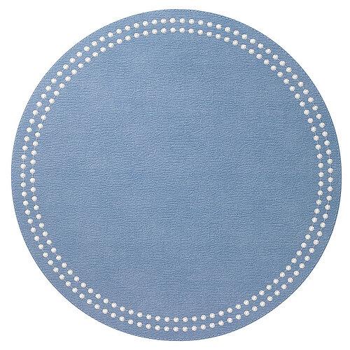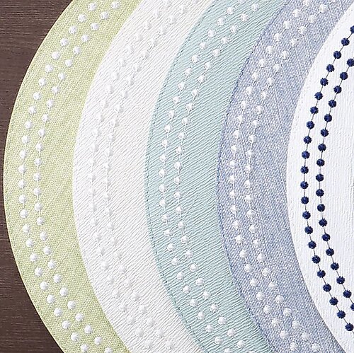Grace your table with the Bodrum Pearls Iceberg and White Placemats, designed to offer a touch of refined elegance with practical features. These 15" round placemats are beautifully adorned with pearl-like embroidered dots along the edges, creating a delicate border that complements any table setting. The cool tones of iceberg blue mixed with crisp white bring a serene and sophisticated palette that enhances the ambiance of your dining space. Special order, usually ships in 1-2 weeks. Made in Turkey. Click link to view other Bodrum Placemats
