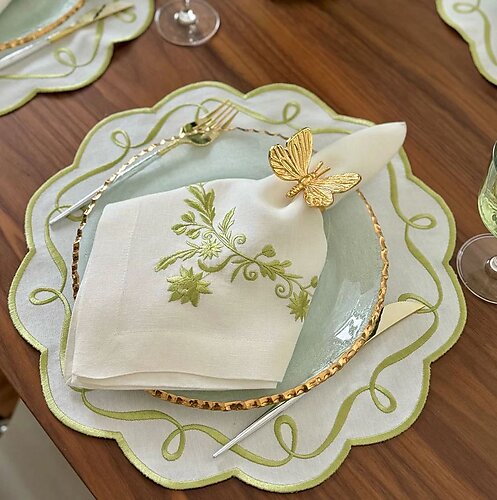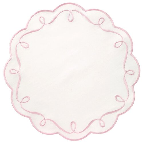 Step into a world of elegance and charm with Bodrum Ribbon Twirl placemats. Also available as napkins. These fabric placemats, adorned with exquisite embroidery, present a blend of functionality and style that elevates any dining occasion. Available in an array of captivating colors - Rose Pink, Ice Blue, Navy Blue, Celadon, Gold and Silver, Red and Green, White, and Willow Green - each piece is designed to add a pop of color and sophistication to your tablescape. The scalloped round shape, measuring 15 inches, introduces a unique aesthetic that complements both traditional and contemporary table settings. Special order, usually ships in 1-2 weeks.