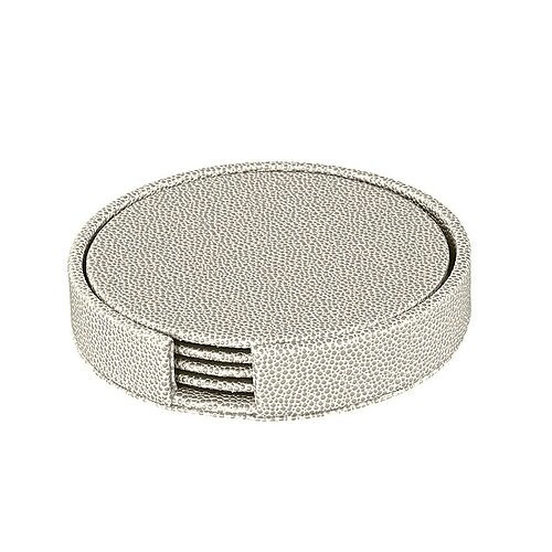 Each set includes four 4" round coasters nestled in a bespoke holder, making storage and accessibility effortless. The thoughtful addition of felt on the bottom of each coaster ensures that surfaces remain scratch-free, blending function with finesse. Whether you're enjoying a casual family gathering or hosting an elegant dinner party, these coasters serve as the perfect accessory.