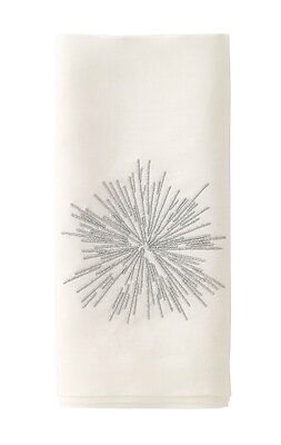 The explosion of metallic embroidery on this exquisite white linen napkin is sure to leave your guest with a memorable holiday experience. Starburst is the quintessential holiday party napkin!