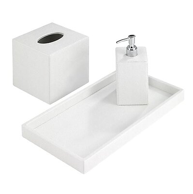 Size: Tissue Box 6" x 6" x 6"; Vanity Tray 14.25" x 7.5" x 1.5"; Soap Dispenser 3" x 3" x 7.5"; Waste Basket 9" x 9" x 11".