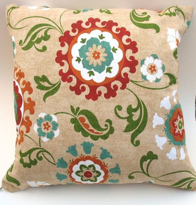 Floral Decorative Pillow. Gold, Turquoise, Red, Orange, Green