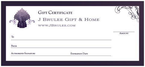 These Gift Certificates are good toward any purchase at J Brulee Home online. Care will be sent via U.S. Postal Priority Mail to either you or your gift recipient. The Gift Certificate includes a code that the recipient can use to place orders online and is valid for one year from date of purchase.