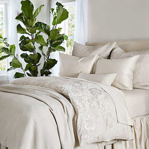 Crafted from natural, undyed fibers, Hibiscus Platinum is as clean and pure as it is indulgent. Certified Oeko-Tex and machine washable, it's made for the modern home that values beauty, health, and convenience. The silk adds a silky-soft, almost ethereal texture, while the linen ensures durability and coolness. Together, they create an elevated, breathable bedding experience that's ideal for all seasons. Tie-closure details on the decorative pillows lend a soft finishing touch to an already polished ensemble.