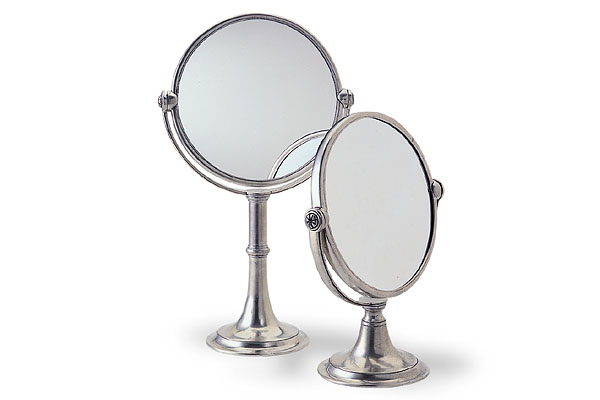 These Italian pewter vanity mirror featurer mirrors on both sides. One side is a 3x magnification and the other side is regular magnification. Match Pewter is handmade by artisans in the