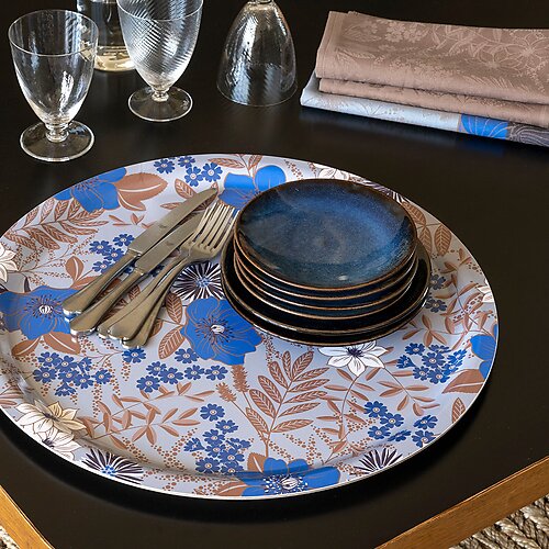 Transform your table setting with the Le Jacquard Français Cottage Blue Tray, a 19" round celebration of English countryside charm. Inspired by wildflower meadows and timeless cottage gardens, this tray bursts with cheerful blues and seasonal florals-anemones, phlox, and asters-woven into a soft, geometric palm pattern. It's a vibrant way to serve drinks, breakfast, or desserts while making every moment feel a little more joyful. Special order, usually ships in 3-5 weeks.