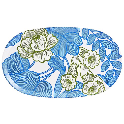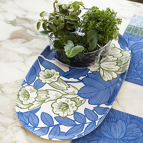 Transport your table to a lush paradise with the Le Jacquard Francais Escapade Tropicale Blue Tray. This vibrant 13" x 22" oval tray bursts with exotic florals and lively leaf motifs in bold tropical blues and greens. It captures the spirit of a sun-soaked getaway-carefree, colorful, and full of joy. Whether serving chilled cocktails or a fruit-filled brunch, this tray turns every moment into a warm-weather celebration. Special order, usually ships in 3-5 weeks.