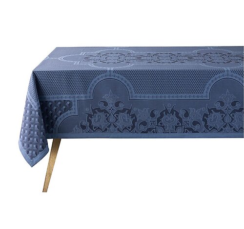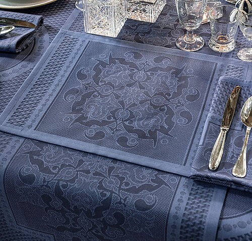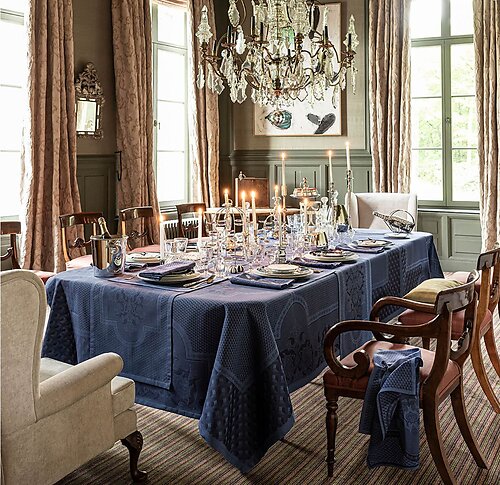 Made with care in France from 100% long-staple cotton, these luxury jacquard linens are woven with remarkable precision and craftsmanship. The fabric's dense weave offers an elegant drape and a soft-yet-durable finish, ensuring your tablecloths, placemats, napkins, and runners not only look stunning but are made to last. The deep blue color is both bold and versatile-perfect for pairing with gold flatware, crystal glasses, or rustic ceramics for a look that's uniquely yours.