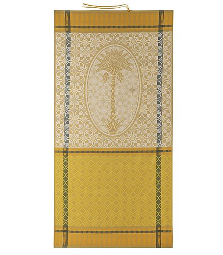 Rooted in French textile artistry, the Palmerie Yellow towel is a true masterpiece. The jacquard weave technique creates a rich texture with intricate detailing, making the central palm tree design feel alive with elegance and movement. The vibrant yellow hue reflects the warmth of golden hour, while the geometric patterns ground the piece in modern sophistication. It's more than a towel-it's an expression of effortless chic, crafted with care and purpose.
