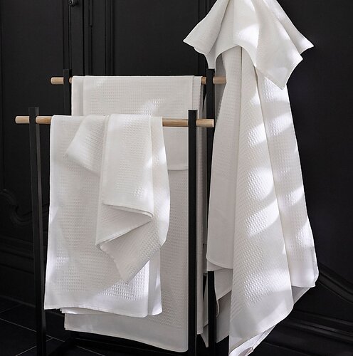 Proudly made in France, this collection showcases the finest in textile artistry. Each towel is a delicate balance of tradition and design, with waffle texture that gently exfoliates while feeling incredibly soft against the skin. The crisp white hue complements any bathroom décor, while the graceful drape and tactile beauty of the 205 gsm cotton elevate even the simplest rituals. Choose from bath sheets, hand towels, guest towels, and more to build your perfect set.