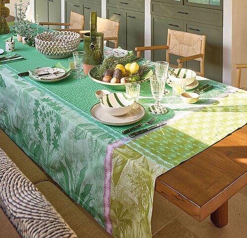 Elegance is in every detail. Crafted from 100% premium cotton and expertly jacquard woven in France, these linens offer a luxurious feel that's soft, durable, and made to last. The collection includes tablecloths, placemats, napkins, and table runners, all designed to seamlessly elevate any occasion-from everyday meals to nature-inspired celebrations. The textured weave brings depth and sophistication, while the tropical green palette adds a sense of calm and connection to the earth. This is craftsmanship at its most refined.