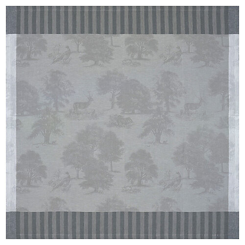 The Souveraine silver table linens are adorned with a toile de Jouy design featuring a serene panorama of woodland creatures amidst flourishing greenery. The delicate portrayal of pheasants, wild boars, fawns, and hares set against a backdrop of opulent foliage brings a storytelling element to your dining experience, turning every gathering into a picturesque feast.