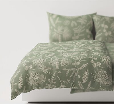 Leitner Ponderosa (aka Foresta) bedding is 100% linen and features a realistic forest motif of firs, larches and pines.