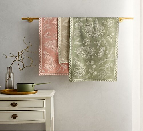 Leitner's Tahoe Kitchen Towels are a celebration of the great outdoors and the myriad forms of evergreen beauty. These half-linen towels, adorned with lifelike forest motifs, are not just kitchen accessories; they are pieces of art designed to delight cooks and nature lovers alike. The precision weaving ensures that the pattern perfectly fits the size of the cloth, showcasing the realistic depiction of various native evergreen species. Whether it's the soft touch of the fabric or the visual appeal of the detailed pinecones, the Tahoe collection invites you to bring the serenity and richness of the forest into your home. Let these towels whisk you away to nature, adding a touch of wilderness charm to your kitchen décor.