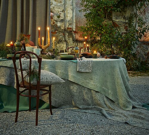 Vienna isn't just for the bedroom-it's a statement across every room. Its large-scale pattern and rich ornamental detail add sophistication to tablecloths, placemats, napkins, and decorative pillows. Whether you're hosting an elegant dinner or styling a relaxed breakfast nook, Vienna creates a setting that feels curated and elevated. Pair Arctic Blue linens with antique silver for a refined look, or mix Jade Green with natural wood tones for timeless charm. The natural texture of linen enhances every surface, while the elaborate motifs add storytelling and soul to your interior design.
