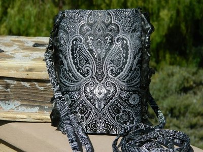 BLACK SATIN TAPESTRY bag by Lisa Berck Luxurious black and silver satin tapestry imported from India, this Stephanie bag is trimmed in black Borello lambskin from New Zealand. Great with a casual ensemble of jeans and a white T-shirt to add a bit of a vintage vibe or wear it as a wristlet with that little black dress out for the evening.