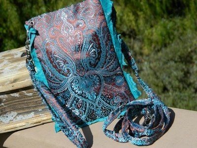 TURQUOISE & BROWN SATIN TAPESTRY bag by Lisa Berck. The combination of the , silver and brown satin tapestry imported from India is so deliciously amazing and rich looking. Trimmed in turquoise Borello lambskin this bag most definitely makes a statement and is a great accent piece to any outfit....