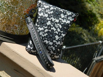 The Vintage Leather & Lace small handbag is an soft white Italian lambskin leather hide that was covered in black lace. The backside is in luxurious black borello lambskin and each full flower has a black diamond Swarovski crystal in the center.
