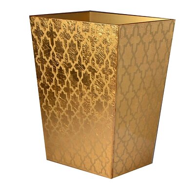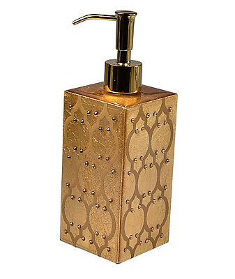 Mike & Ally Arabesque Gold Leaf bath accessories are hand made multi-textured pieces in which artisans apply a traditional arabesque pattern over gold leaf. The pieces are then clear coated. Crystal items accented with Topaz color crystals.
