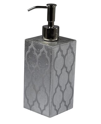 Mike & Ally Arabesque Silver Leaf bath accessories are hand made multi-textured pieces in which artisans apply a traditional arabesque pattern over silver leaf. The pieces are then clear coated. Crystal items accented with small black diamond crystals.