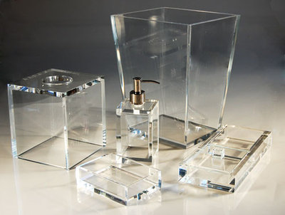 Elevate your bathroom with the unadulterated elegance of the Mike & Ally Clear Ice collection. These accessories epitomize modern sophistication with their crystal-clear lucite acrylic construction, offering a clean, stark look that complements any contemporary decor. Each piece in this collection, including wastebaskets, soap pump dispensers, tissue box covers, vanity trays, soap dishes, and tumblers, is crafted from heavy-weight 3/8" and 1/2" lucite, ensuring both durability and a chic aesthetic that celebrates simplicity and quality.