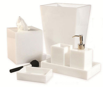 Introduce a touch of pristine elegance to your bathroom with the Mike & Ally White Ice collection. This suite of modern bath accessories, including wastebaskets, soap pump dispensers, tissue box covers, vanity trays, soap dishes, and tumblers, embodies a clean and stark design aesthetic. Crafted from heavy-weight 3/8" and 1/2" lucite acrylic, each piece is a testament to enduring quality and sleek modernity. The solid white finish enhances any contemporary bathroom, providing a fresh, crisp look that is both visually appealing and timeless.