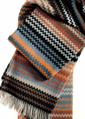 This wool blend Missoni Humbert color T60 throw and pillow features a blend of colors, including grey, brown, black and orange in a zig zag pattern. Made of 87% wool and 13% polyamide.