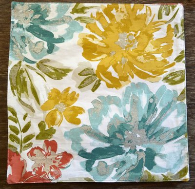 These elegant floral placemats feature a blend of colors including yellows, turquoise, coral, green and tan on a creamy white background and accented with metallic silver. Made of a thick cotton twill type fabric to provide substance.