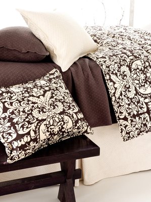 Gianna Chocolate Bedding is a washable 100% Cotton twill and features a blend of Chocolate Brown & Cream in a beautiful damask pattern. The duvet cover is reversible to the same print with a self-piped trim and button closure. Shams also have a self-piped trim with a tie closure on reverse.