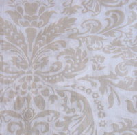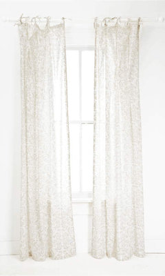 These soft white and platinum taupe window panels feature a fleur pattern and are lightweight