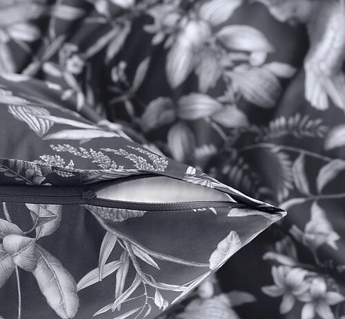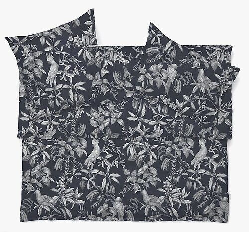 The Calypso Noir design is more than just bedding-it's a work of art. Let your eyes wander through the lush treetops, where you'll discover cocoa fruits, trumpet-like flowers, and exotic leaf shapes. Peer closer, and you'll spot playful cockatoos and parrots hidden within the foliage, adding a whimsical touch to this tropical paradise. Every fine pencil-drawn detail is meticulously printed onto the luxurious sateen fabric, creating a sense of depth, movement, and mystery that captivates with every glance.