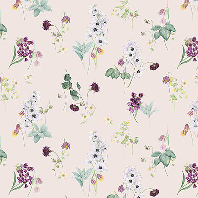 Schlossberg's Freya Beige features a delicate potpourri of iridescent green tones together with lilac and beige-pink flowers. Colorfully mixed lady's mantle, delphinium, Christmas roses, bell and checkerboard flowers complemented with sage, beech and birch leaves.