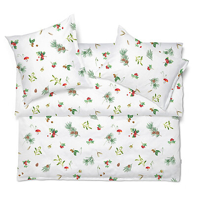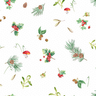Schlossberg's Hazel features a blend of forest plants, including pinecone, mushrooms, acorns and red berries printed on Puntino blanc base fabric.