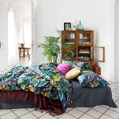 Schlossberg's Jane Vert features the depths of the tropical night, ocher leaves glow next to lush passion flowers and exotic lilies and fuchsias. A golden parrot sits proudly on a branch, shimmering hummingbirds are just a wing beat away and a black-feathered toucan almost melts into the darkness of the jungle night. Sumptuous green shimmering leaf compositions featuring tropical plants roam across the end of the Jane bed linen design in Satin Noblesse.