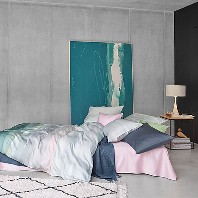 Schlossberg's Manoa features a flowing wave-like gradient of color gradients. Artful transitions of velvety blue, cool and warm shades of greens, to delicate taupe and powdery pink.